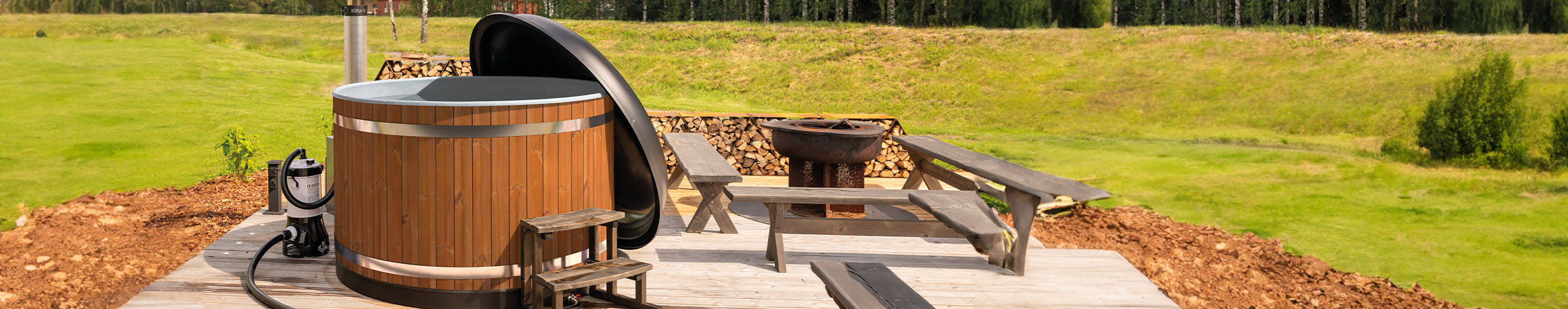 Som uppvärmare används en utvändig, grå Cult-si-kamin som passar små badtunnor. Kaminen är tillverkad i högklassig, värmeledande marinaluminium.