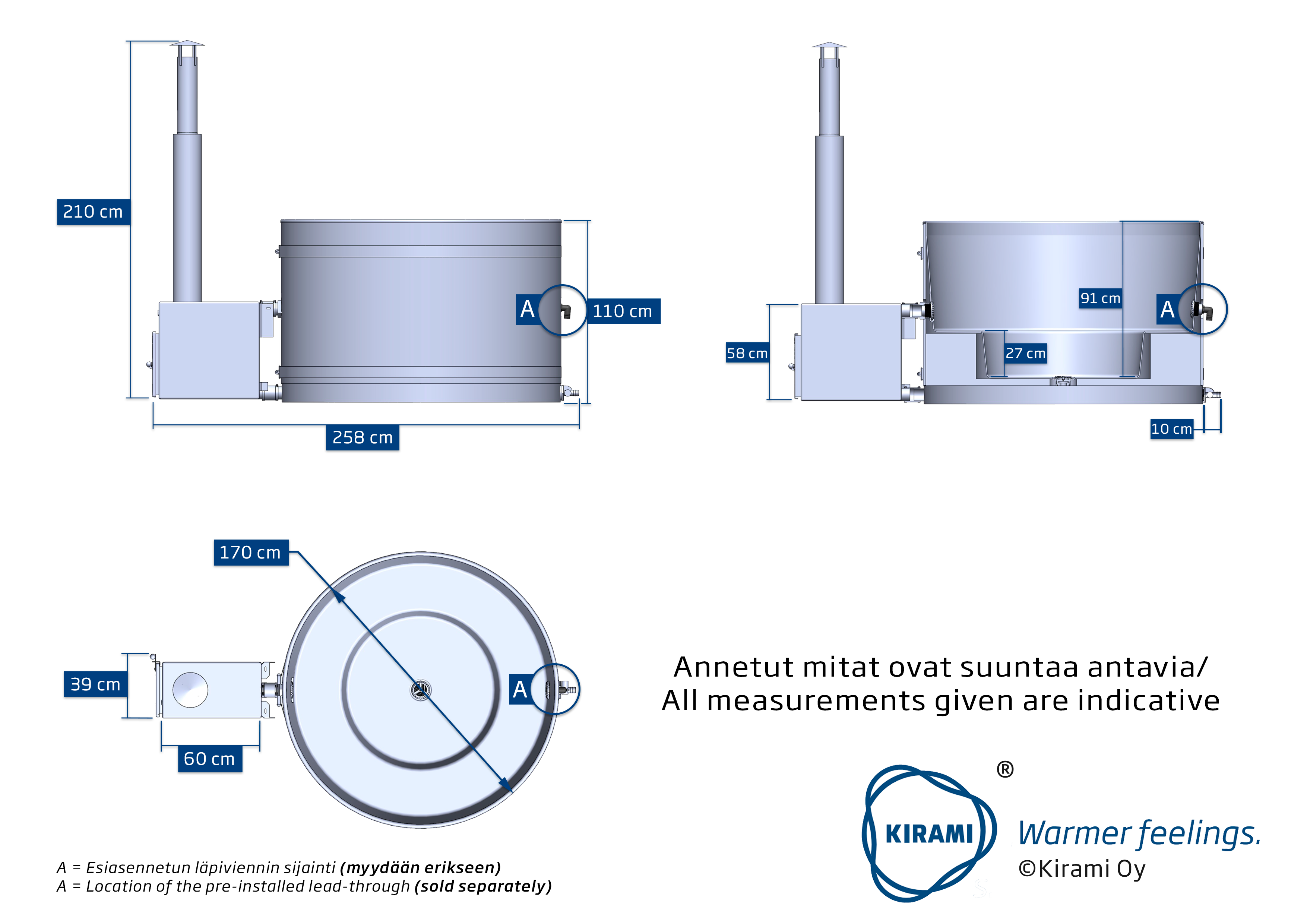 Tunnans diameter är 170 cm, vattenvolym 1540 liter och den lämpar sig för 4-6 personer. Badtunnans torrvikt är 142 kg, CULT-si-kaminens bruttoeffekt är 36 kw och nettoeffekten som överförs till vattnet är 22 kw.