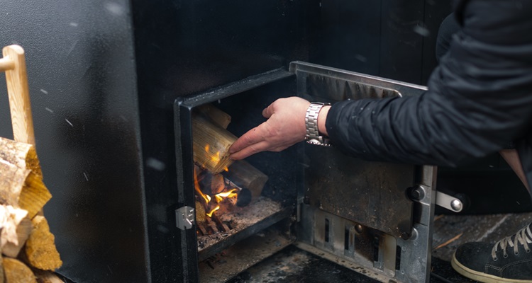 Du värmer up en modern badtunna med utvändig kamin lika lätt på vinter som på sommar. Fyll up tunnan med vatten, lägg ved och tändmaterial i kaminen samt tänd eld.