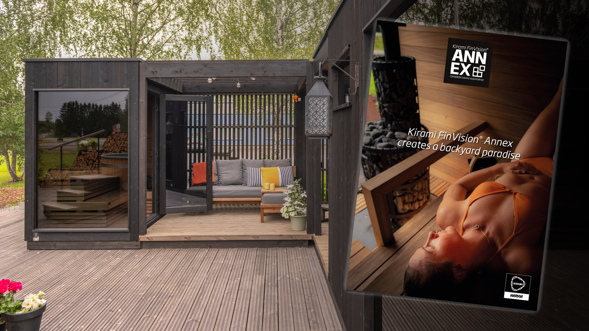 Modulerna Kirami FinVision® Annex öppnar dörren för dig att bygga ett unikt paradis i din trädgård. Modulkonceptet ger dig möjlighet att välja de element som passar dina behov och kombinera dem kreativt och sömlöst. Modulerna omfattar en bastu, ett omklädningsrum, en terrass, en lounge, en patio och en pergola som du kan kombinera enligt dina preferenser eller så kan du skaffa endast en enskild modul. Modulerna är utformade med ett enhetligt utseende, så att nya delar passar ihop med föregående vad gäller både konstruktion och utseende.