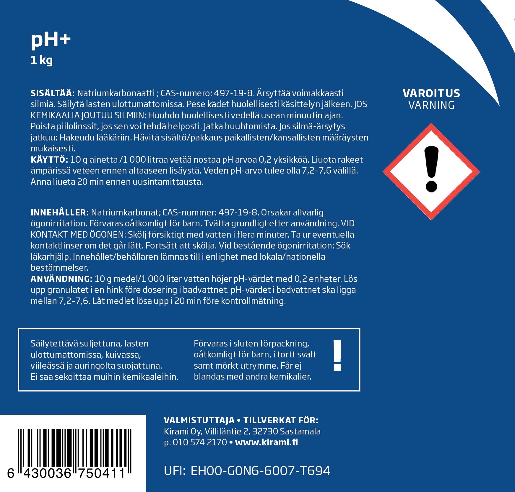 Med hjälp av Kirami pH+ korn höjer man vattnets pH-värde. Ett för högt eller för lågt pH-värde irriterar huden och anfräter badtunnans material. Det idealiska pH-värdet är 7,4 men det rekommenderas att åtminstone hålla sig inom 7,2-7,6. Vattnets pH-värde mäts med pooltester / teststickor som kan köpas från Kirami.
