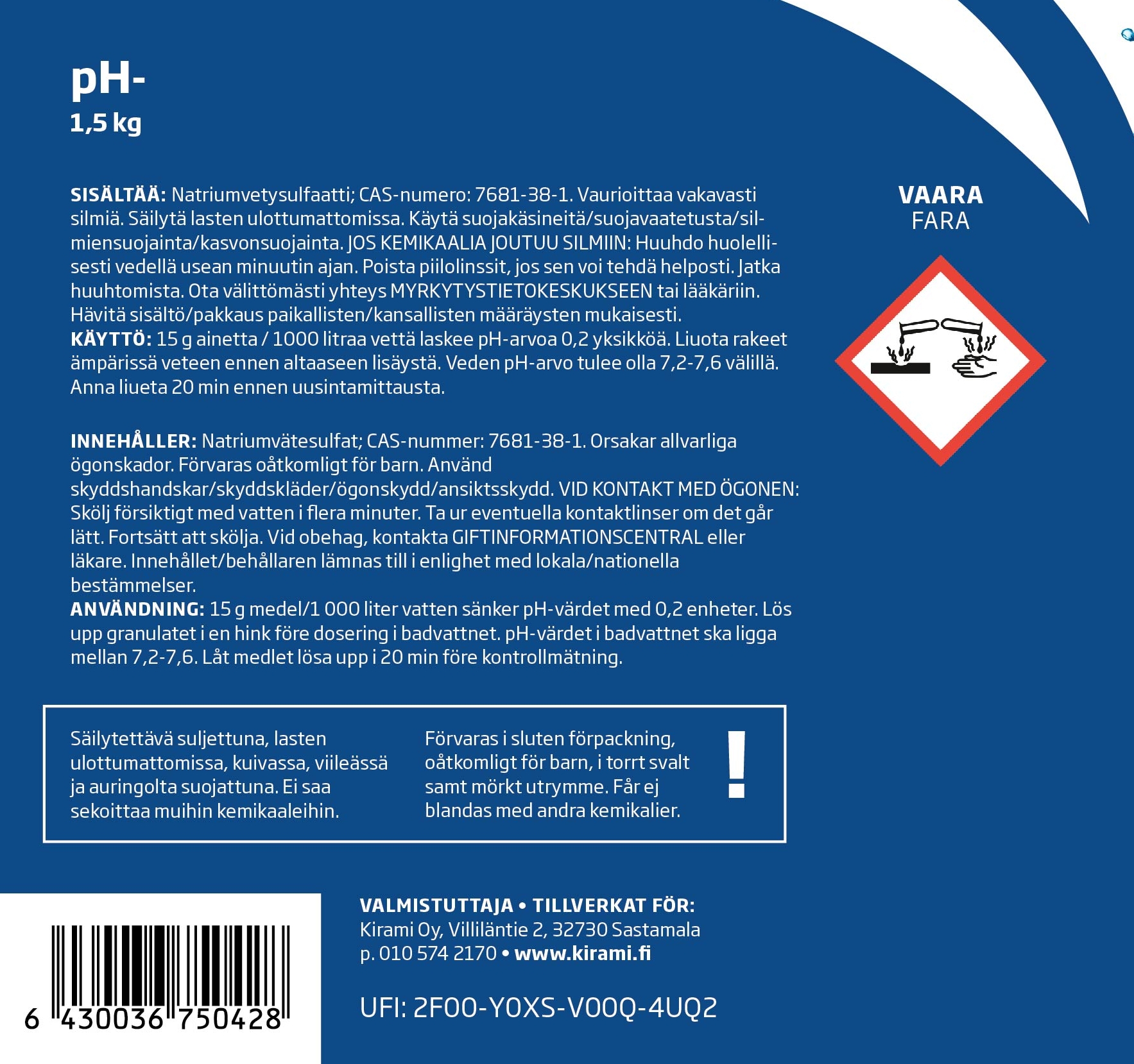 Det är viktigt att observera badvattnets pH-nivåer och vid behov kan nivåerna justeras med kemikalier. Med hjälp av Kirami pH- korn sänker man vattnets pH-värde. Ett för högt eller för lågt pH-värde irriterar huden och anfräter badtunnans material. Det idealiska pH-värdet är 7,4 men det rekommenderas att åtminstone hålla sig inom 7,2-7,6. Vattnets pH-värde mäts med pooltester / teststickor som kan köpas från Kirami.