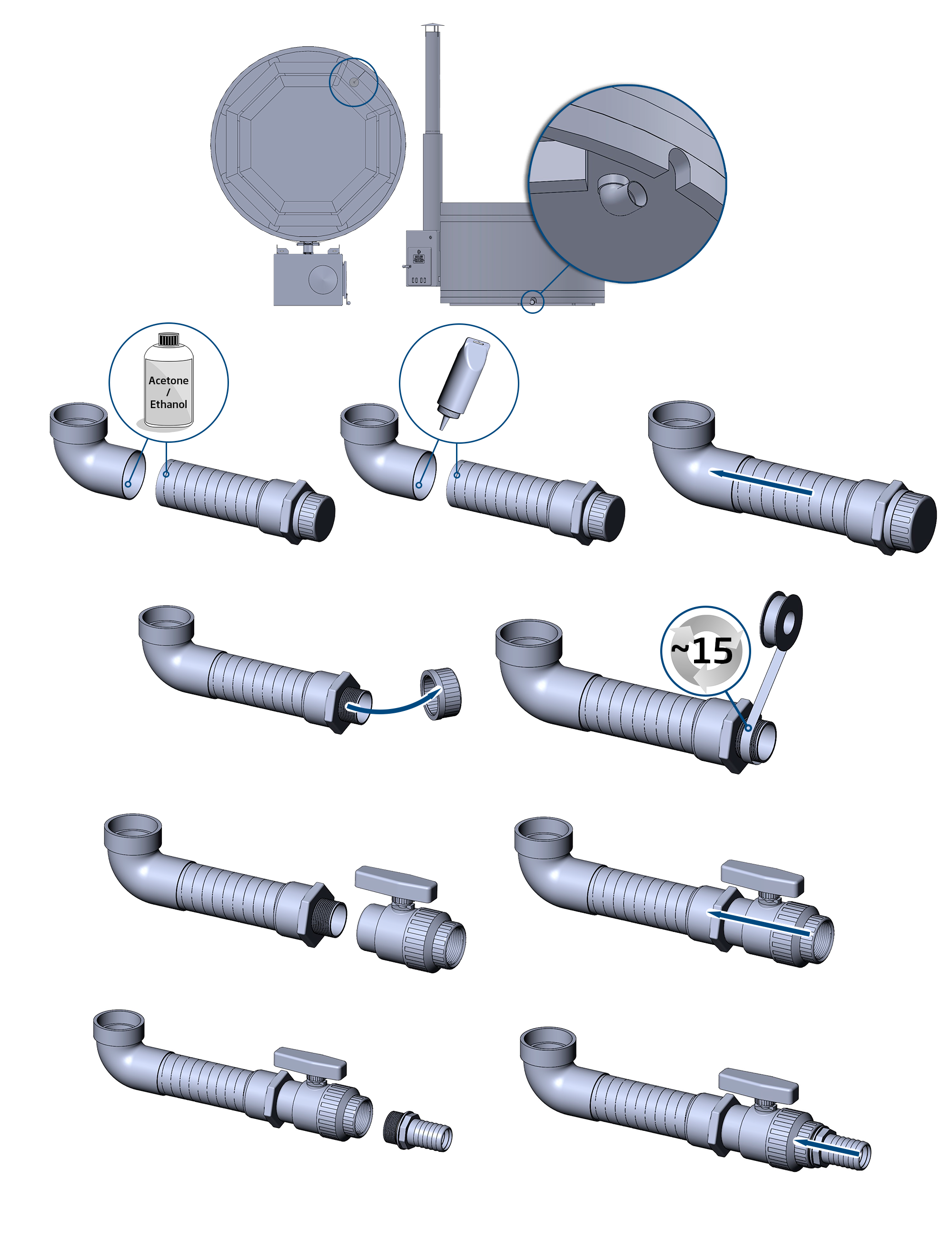 Serie av delar för förlängning av utloppet på Woody-tunnor. Med detta kan du stänga tunnan från utsidan och får i ventiländen även en slanganslutning som kan kopplas till en separat slang med en inre diameter på 38 eller 32 mm. Seriens anslutningsslang med en yttre diameter på 50 mm ska limmas fast med det medföljande PVC-limmet i utloppets vinklade rör under tunnan. Slangen är dimensionerad så att ventilen hamnar precis utanför Kirami Woody-tunnans vägg.