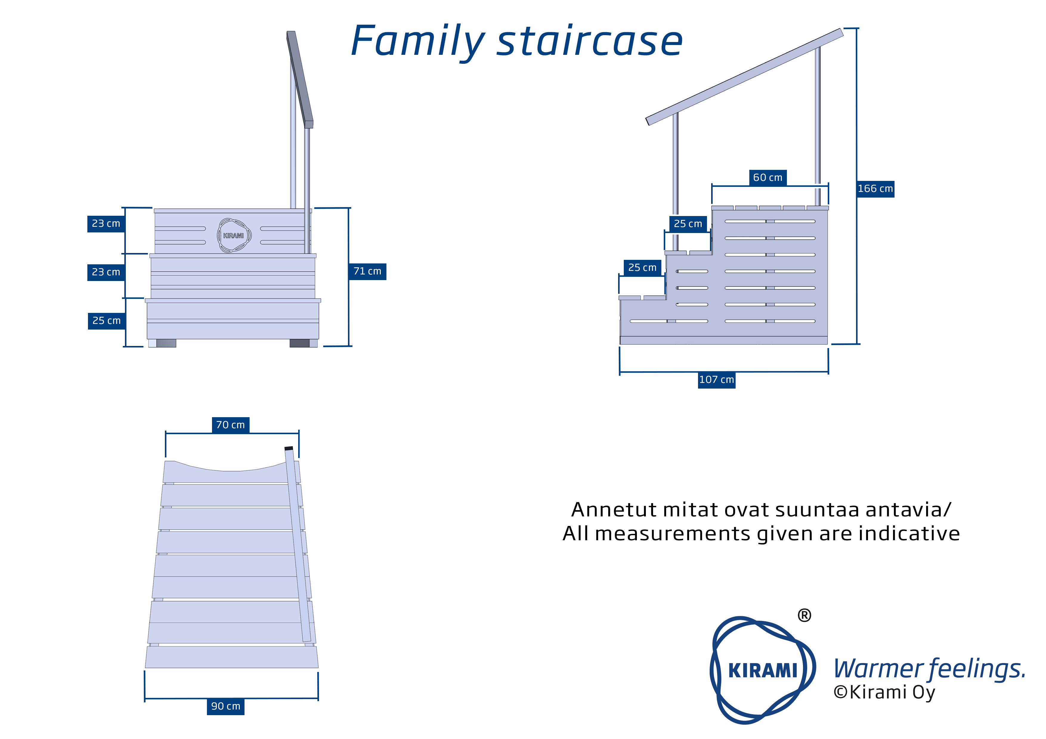 En 71 cm hög trappa för Family-tunnor med ett 85 cm högt räcke för lättare in- och utstigning. Trappan är stadig och så bred att du kan lämna till exempel tofflorna på trappan för badstunden. Samtidigt har trappan planerats som en kapsel för ett litet massfilter. I kapseln ligger filtret gömt och i skydd mot väder.