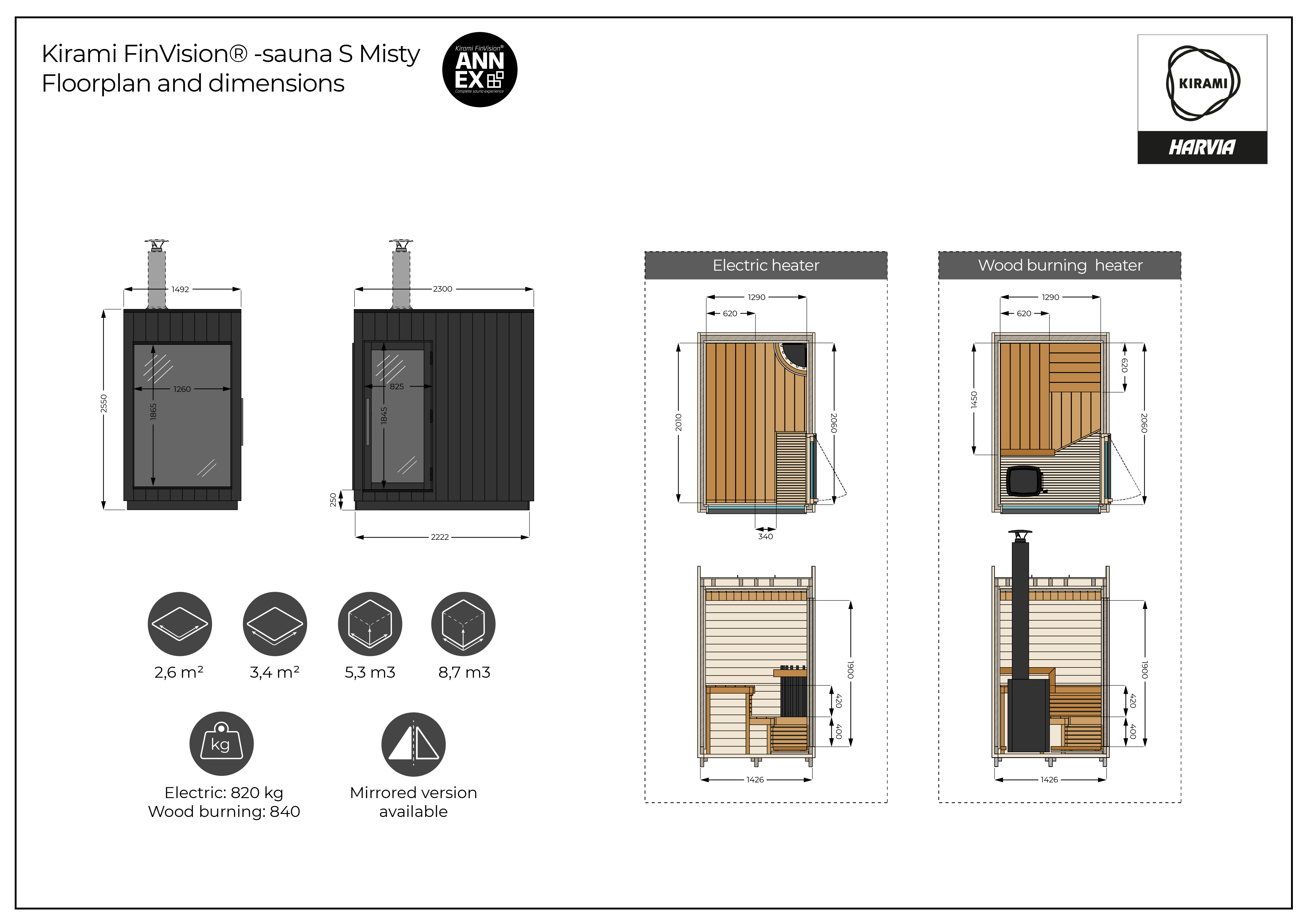Det yttre skalet och bastuns inre är modern och stilmässigt likadan som de övriga modulerna i serien Kirami FinVision® Misty. Den avskalade och enkla stilen lämpar sig i synnerhet för små gårdar eller vid solaltaner. Bastuns stora glasytor ger en känsla av rymd och luftighet, och även naturen kommer närmare badaren.