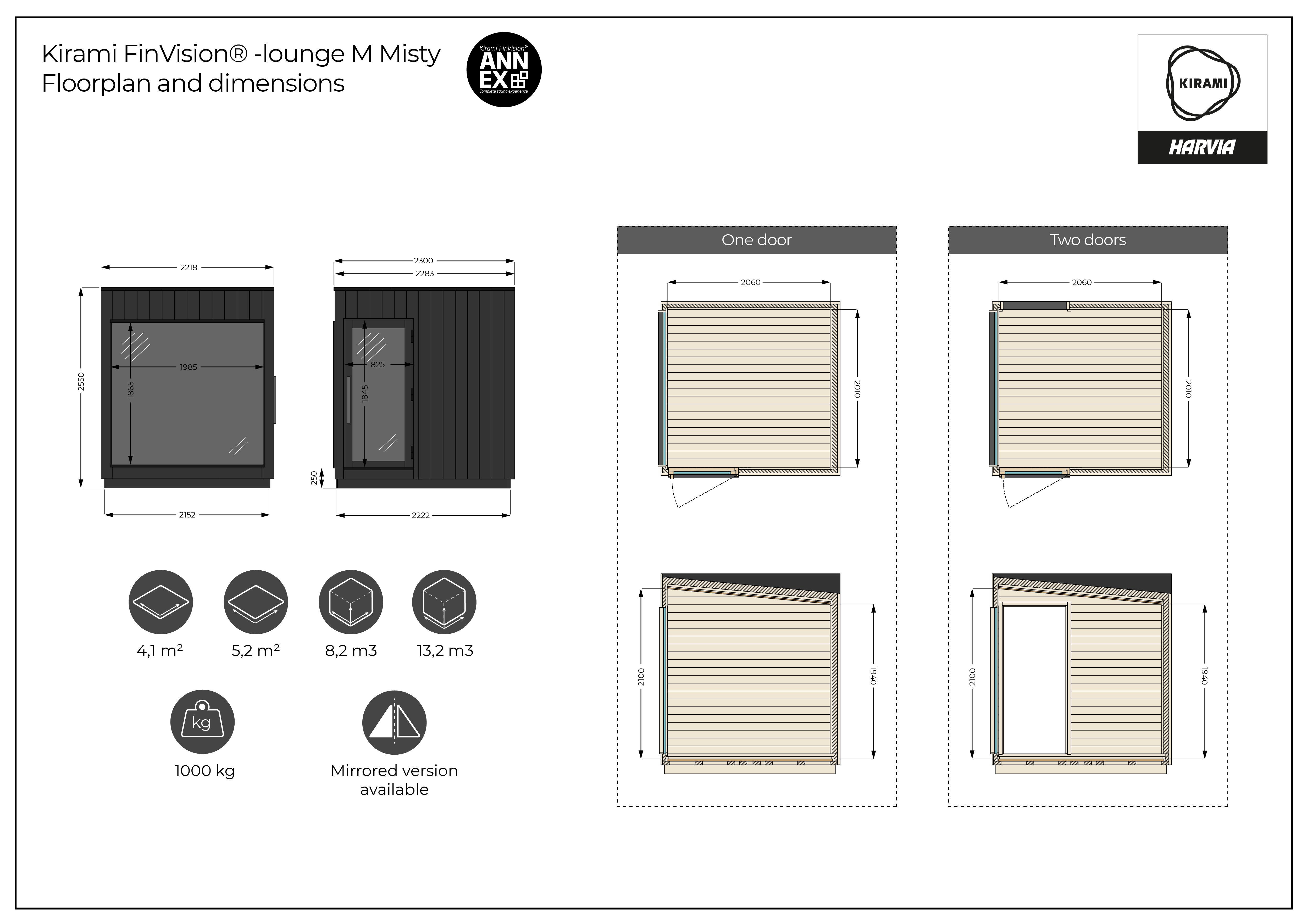 Kirami FinVision® -lounge M Misty är en separat färdig modul med alla väggar på plats. Den passar skarvfritt ihop med andra Kirami FinVision® Misty-moduler, eller fungerar lika bra som en fristående byggnad. Det finns tillräckligt med utrymme för olika inredningsalternativ beroende på användningsändamålet. Loungen kan exempelvis vara en plats att svalka sig eller arbetsrum. Loungen kan inredas med Kirami FinVision® soffgrupp och matta eller med andra möbler som du väljer.