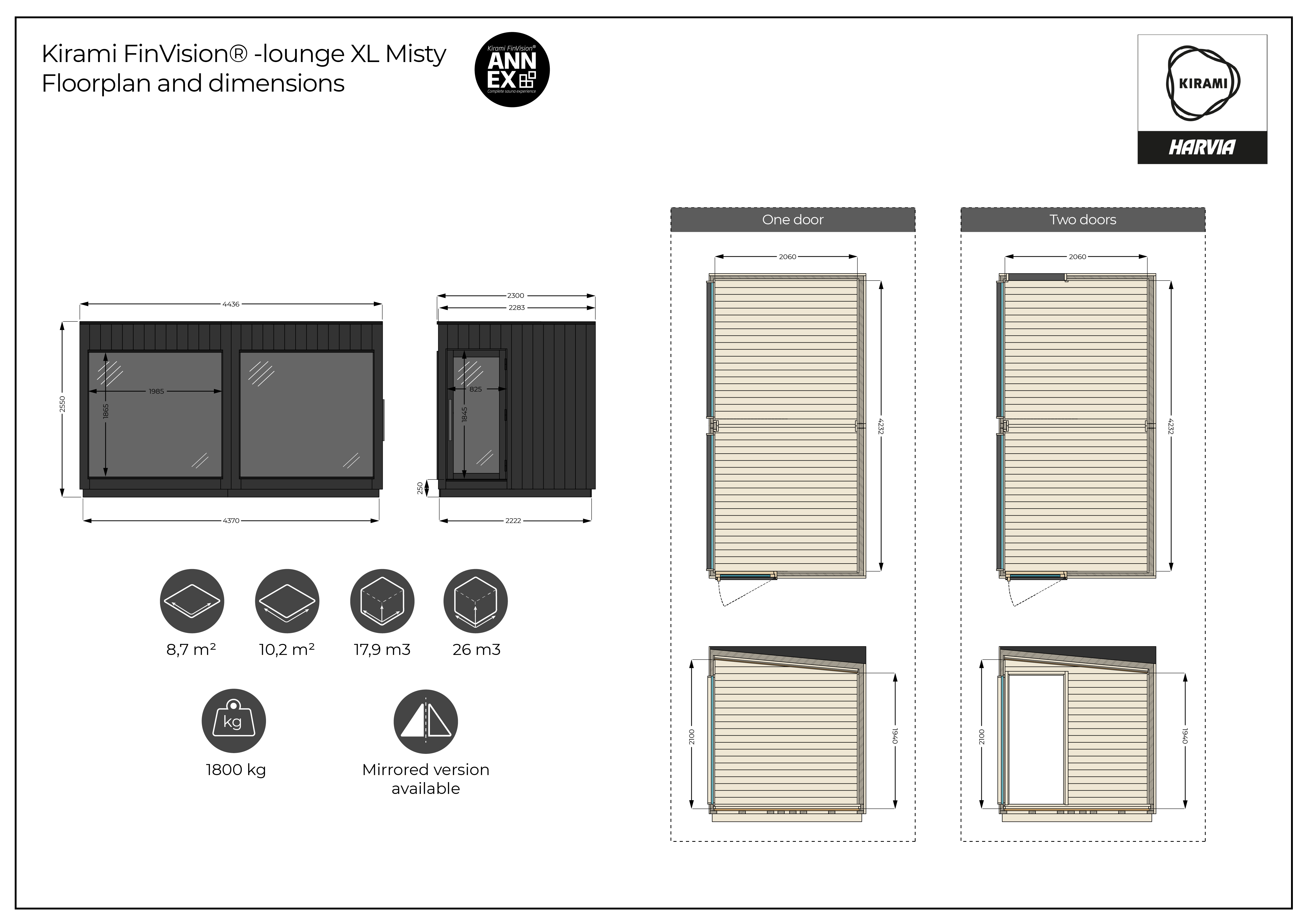 Kirami FinVision®-lounge XL erbjuder ett brett utbud av alternativ för gårdsinredaren. Endast fantasin sätter gränser. Kirami FinVision® -lounge XL Misty består av två förbyggda loungemoduler i storlek M som monteras samman på plats. Den passar skarvfritt ihop med andra Kirami FinVision® Misty-moduler, eller fungerar lika bra som en fristående byggnad. Det finns tillräckligt med utrymme för olika inredningsalternativ beroende på användningsändamålet. Loungen kan exempelvis vara en gäststuga, sovplats, plats att svalka sig, hoppy- eller arbetsrum. Loungen kan inredas med Kirami FinVision® -soffgrupp och matta eller med andra möbler som du väljer.